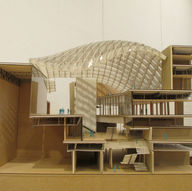 The form is maintained through the use of cast in place concrete and a steel open web joist system. The shroud is a rib system in which members are bolted together and glass panels are inset within it. The program is meant to be circulated in a processional manner vertically moving throughout the program. The entrance is revealed after one bends the corner to be introduced to the shroud structure.